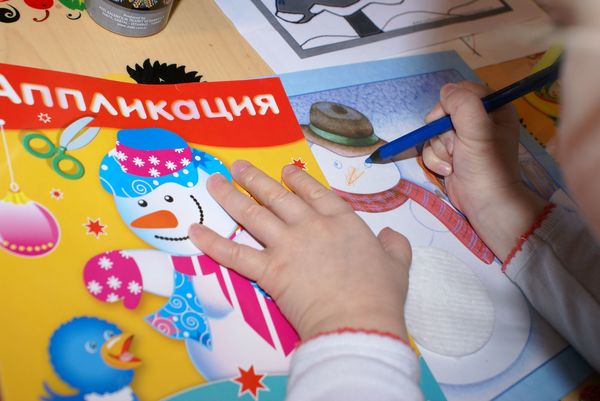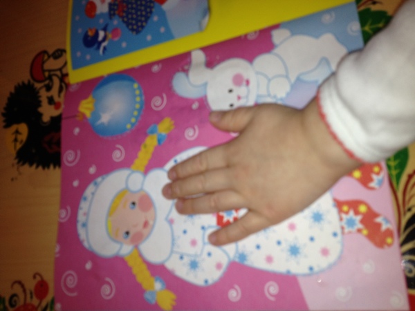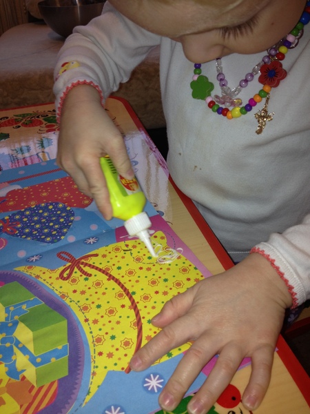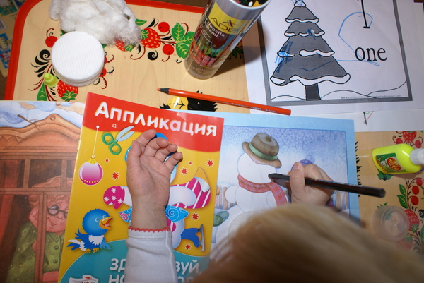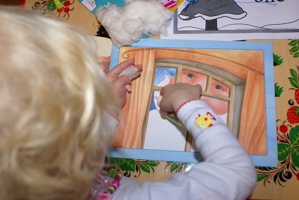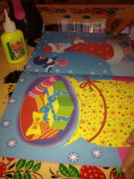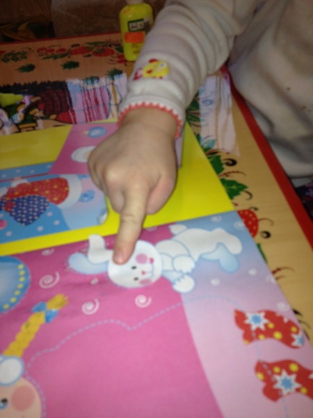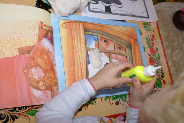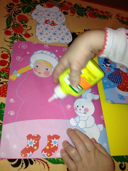 Вырезала я заранее, а Сашуня приклеивала. В это время я читала ей стихи.