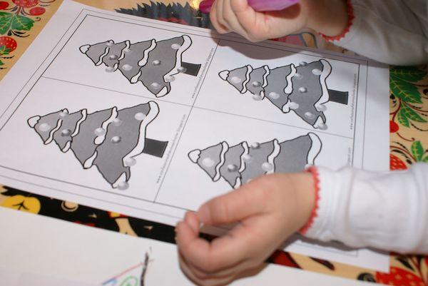 Распечатала шаблоны ёлки и предложила Сашеньке "нарядить" разноцветными шариками.