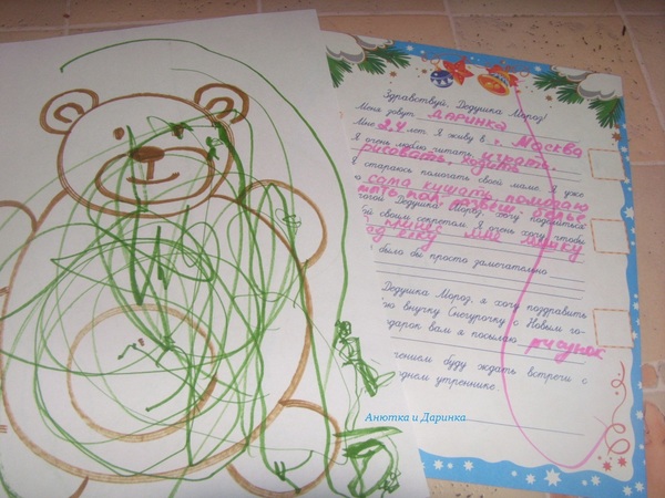 (дочка диктовала, что писать и попросила в подарок Мишку (из подробностей - только то, что он умеет говорить))). Вот думаю - покупать что ли говорящего медведя теперь?)) Линия через все письмо - это ее подпись).