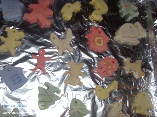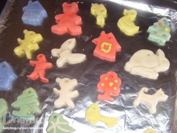 Игрушки замечательные получились! Елочка нарядная будет. ))) А как сделали цветное тесто?