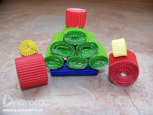 Затем тренировали пальчики в скручивании гофрированного картона и создания елочки и елочных шариков.