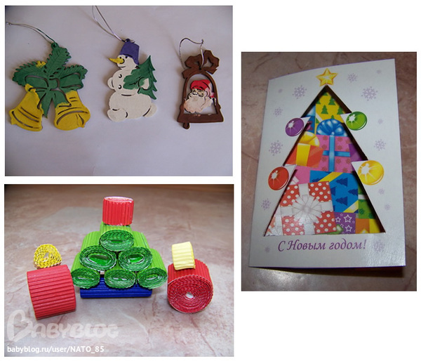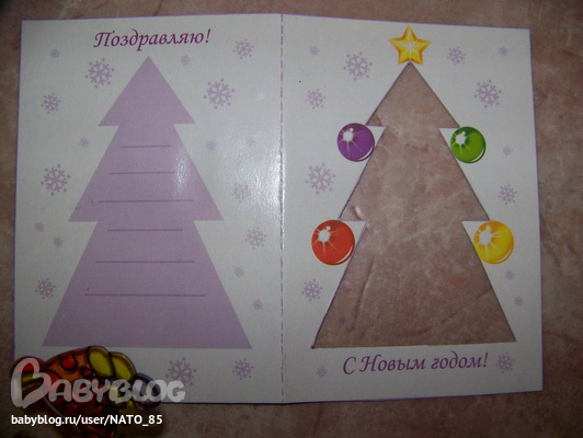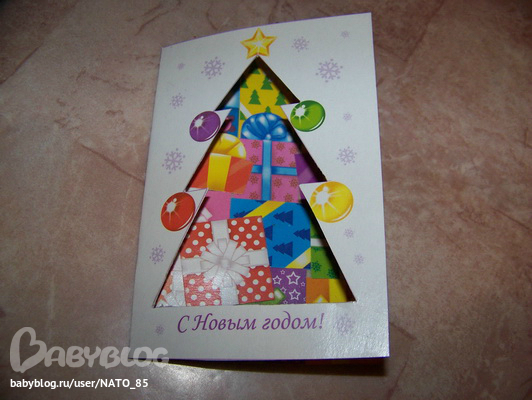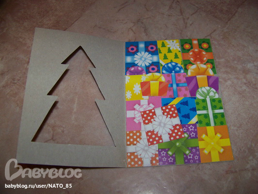 А делали просто, открытка была уже готовая - покупная (набор творчества к НГ), нужно было только прорезать дырочку в елочке и внутрь приклеить заранее мамой вырезанные коробочки-подарочки)