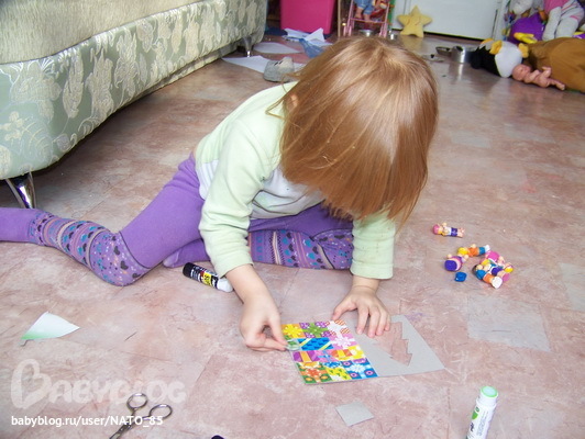 А еще мы с Лизой сделали первую новогоднюю открытку. Я приготовила заготовки и вырезала елочку, а Лизик наклеила подарочки.