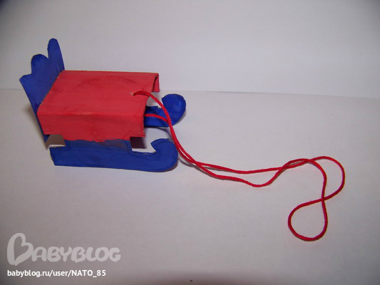 Но ведь олени должны возить сани с Дедом Морозом (не везде же он на лошадках проедет). Нужно дедушке помочь - сани смастерить! Так что мы принялись за дело... Я сделала из картона шаблон, а Лизик его разукрасила.