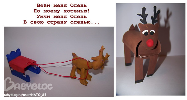 Ален, спасибо! У папы руки золотые, а я вот совсем рисовать и лепить не могу, все на нем)))Вообще можно взять для оленя рулон от туалетной бумаги, но у нас не было, поэтому склеила из картона. Сделала 2 прорези под ножки, и просто потом вставили, можно для надежности клеем проклеить, но у нас они и так прочно стоят. Даже выжил сегодняшний "развоз подарков".