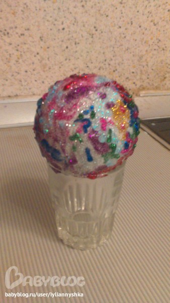 я его нашла)))он на полу у нас волялся)))))))))))))))просто булый елочный шар и мы его блестками зафигачили)))теперь эти блестки наше все,только мы их еще и в придачу едим(((
