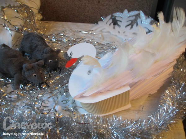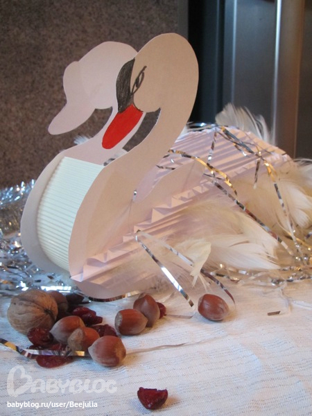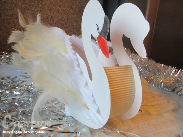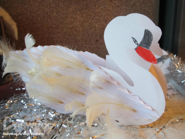 Лебедь сделан из и , крылья из обычных листов и перья