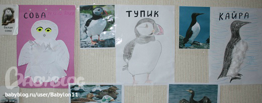 д) птицы Арктики - сова из бумажных "перьев", пуховая грудка кайры и тупика кормим рыбой (на фото рыбы нет и в жизни тоже, так и оставили его голодным, идею оставлю на будущее, зато повторили "большой-маленький")), поделки птиц из пластилина (особенно интересно попробовать слепить гагу!=D)