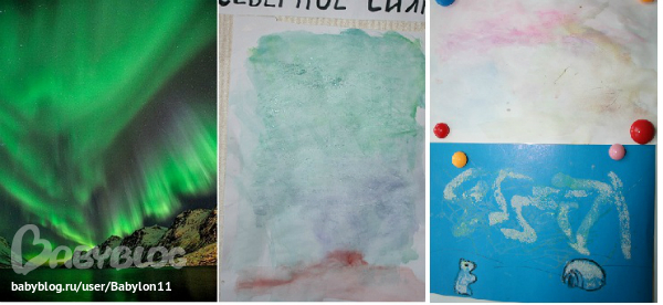 а) пытаемся повторить изображение Северного сияния с помощью красок, а после высыхания даем в руки ребенку клей и глиттер, мажем- сыплем - красота, блеск которой ф/апп здесь не отобразил))