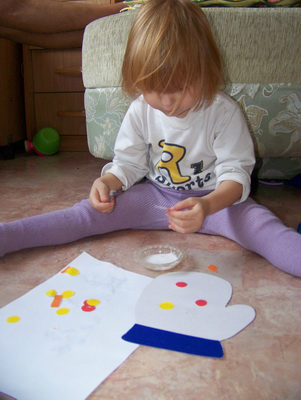 В итоге за два дня сделали таки варежку. Я вырезала из картона шаблон и синий бортик. Изначально предполагалось покрасить варежку краской, а потом узор добавить, но Лиза сказала, что красивее такая! Лиза нарезала бумажки и через трафарет рисовала кружки, о вырезать отказалась, сказала, что маме это нужно делать(