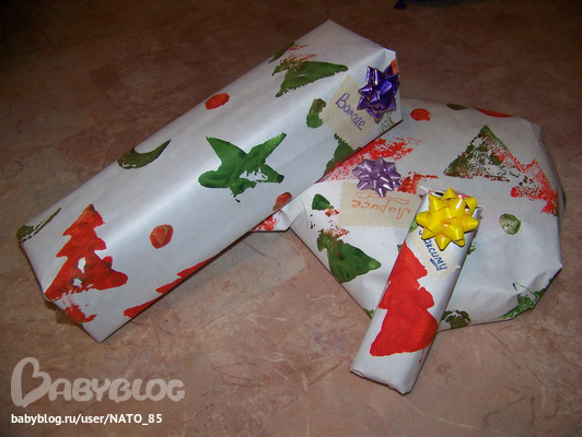 И мы начали упаковывать подарочки в нашу замечательную бумагу. Вернее упаковывала мама, а Лиза контролировала процесс, подбирала и клеила бантик))) По-моему, очень даже празднично вышло!