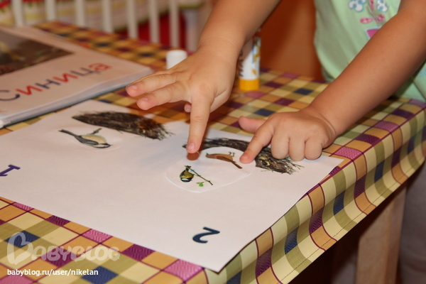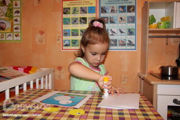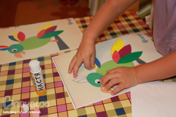 Которой уже кто то (баба или деда, когда Настя ездила погостить к ним на два дня, папка с "Птицами" отправилась с ней) раскрасил клювик и лапки, но клювик мы все равно вырезали и приклеили, чтобы была по-настоящему аппликация! (Вырезала все детели я)