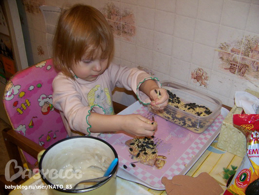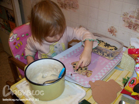 Спасибо!Мы фигурки развесили по веточкам сегодня, а в кормушку насыпали просто пшено, семечки и положили шарик из зерна.