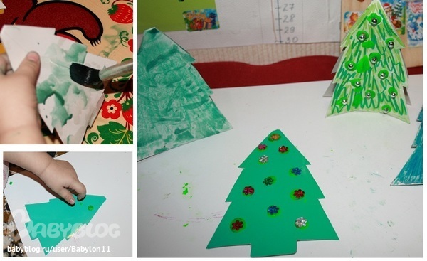 Украшения своими руками. У Алисы получилось клеить пластилин к картону примерно на одинаковых расстояниях, как я и предлагала, и с пайетками/бусами тоже мастерски обращалась (что очень меня радует!), хотя бусинки и норовили постоянно укатиться. В целом моим вкладом было вырезание елок из разных видов картона и доклеивание половины бусинок (доделывать я решила твердо, т.к. новогоднее настроение добыть-то надо, кстати, получилось! )