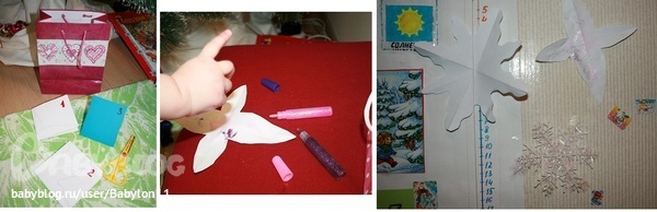 В этот раз заготовки - заранее сложенные листы, на которых карандашом нарисован узор. Подразумевалось, что по этим линиям мы с Алисой будем резать ножницами. Первый узор очень простой, второй сложнее, а третий - голубой лист - свободная тема. Первые два резали вместе. У третьего Алиса сделала пару разрезов, но, видимо, рано нам еще с ножницами иметь дело, а, во-вторых, еще и ножницы не самые удобные оказались, короче говоря, раз уж тема свободная, то начали рвать на кусочки для будущих поделок. Рисовали снег (я рисую рядом, чтобы не вмешиваться в процесс рисования Алисы =) и ее рисунки мне всегда нравятся больше =D). Хотели еще и доску раскрасить, но дочь принесла наклейки =D