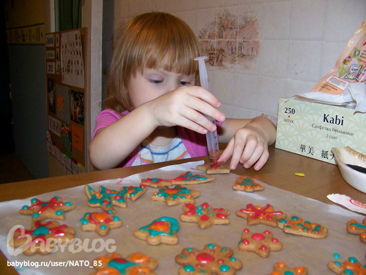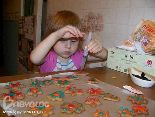Вместе сделали тесто, я помогала раскатывать, так как хотелось потоньше, а Лизик вырезала и убирала остатки. Ну и конечно всей семьей пытались это дело украсить!