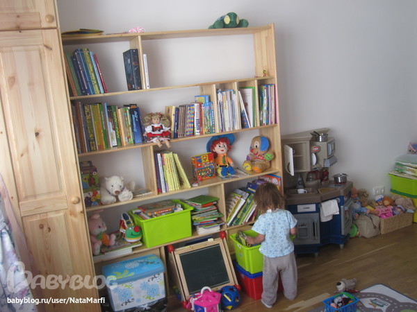 А так у нас специальный шкаф папа сделал, внизу, что в свободном доступе, повыше краски, пластилин и прочее...