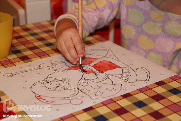 Рисовали, и разукрашивали. Сфотографировать получилось только процесс раскрашивания Деда Мороза.