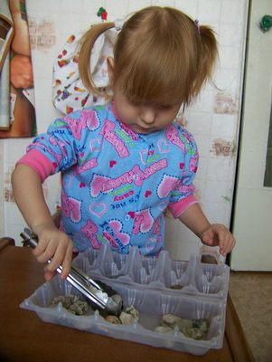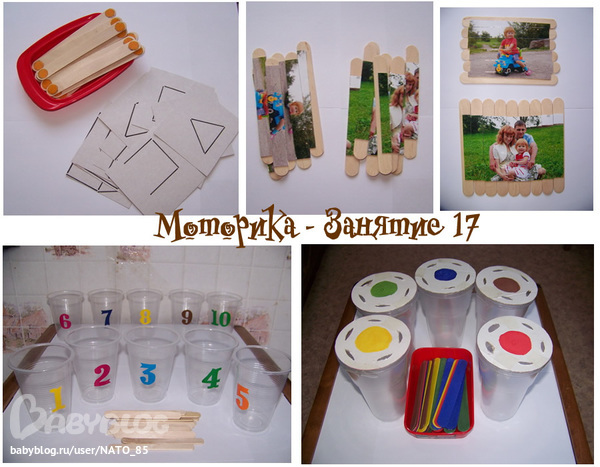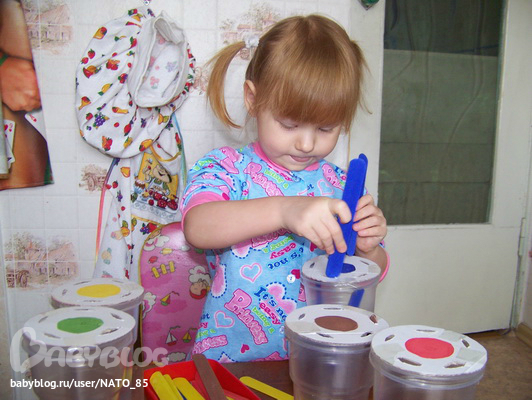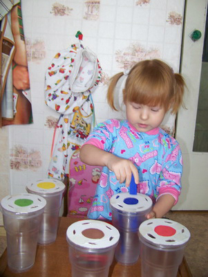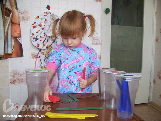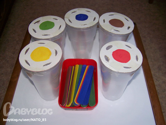 1. Начали мы с сортировки цветных шпателей по стаканам. На каждый стаканчик сделала из картона крышку с пятью отверстиями (под размер шпателя). Нужно было просунуть палочки в соответствующий дом.