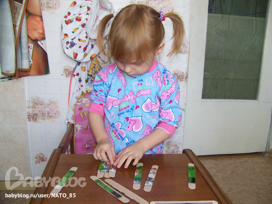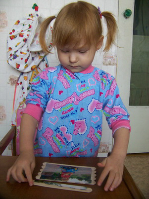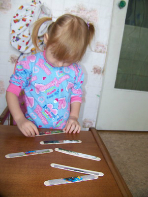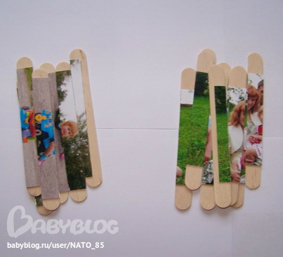 2. Дальше в нашей программе штель-пазл. На палочки с помощью двухстороннего скотча приклеила фотографии и разрезала. Задача просто - нужно собрать правильно фотографию. Справилась моментально и с большим удовольствием.