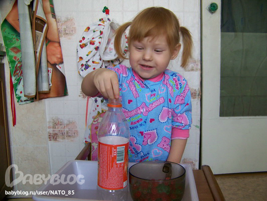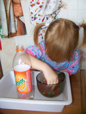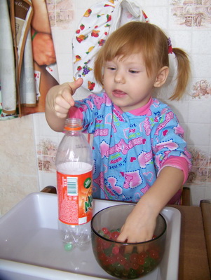 5. Любимое наше занятие - гидрогелевые шарики. На сей раз нужно было их переложить из миски в пластиковую бутылку. Сначала попытались переложить сразу горсть, но все разбежались и после сборов беглецов с пола принялись играть по правилам)))