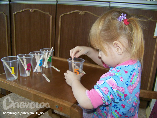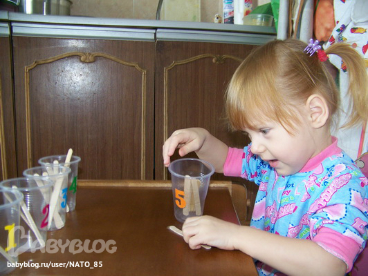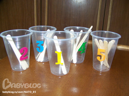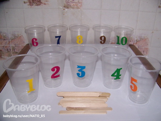 3. Практикуем счет. На каждом стаканчике приклеена цифра от 1 до 10. Нужно положить заданное количество палочек в стакан.