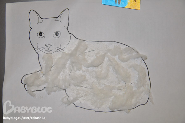 Творчество. На кошечку клеили вату (Егору не очень понравилось, т.к вата прилипала к пальчикам)