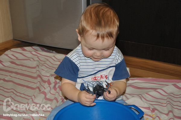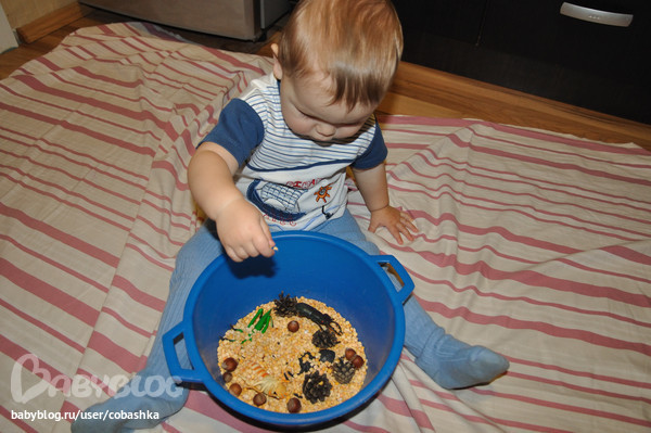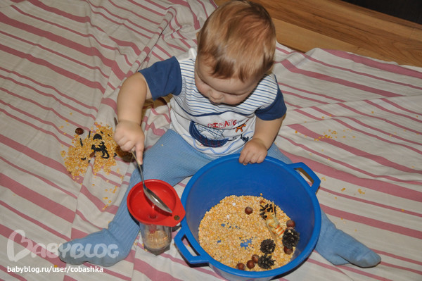 Потом Егор решил паука закопать, поиграть горохом.