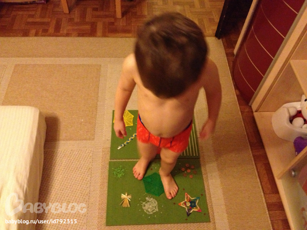 Анюте показала, что по нему нужно ходить, но она все больше его ковыряет, бегает ножками, только вместе со мной - беру ее за руку и говорю "побежали, побежали!" и бегаем вперед-назад, пробегая по коврику ))