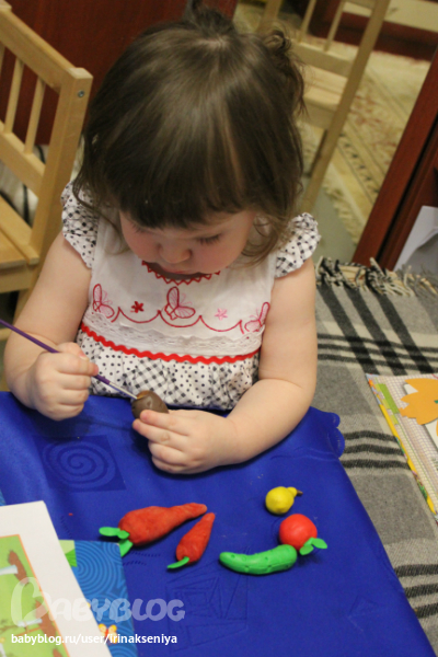 Рисовали красками через трафарет, лепили))Ксюша усердно пытается сделать картошку похожей на картошку)))