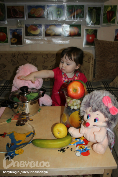 Варили компотик из фруктов и супик из овощей)))очень понравилось Ксении это задание, ну и конечно помощниками были Ежик и Зайчик)