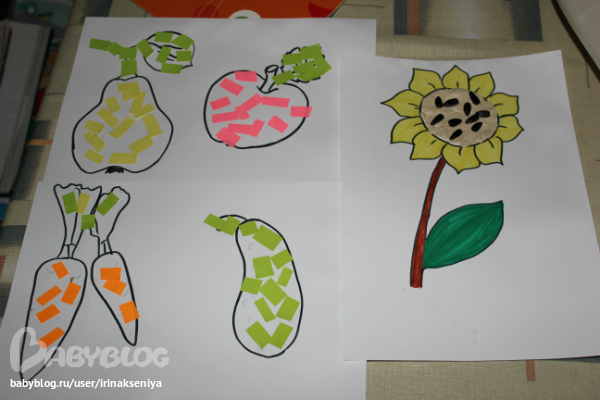 Клеели аппликации фруктов и овощей. Ксюша такая брезгливая, сколько я ей предлагала манкой аппликации делать, она даже не притронулась, только говорила: фу) и все... Сделали еще подсолнух с семечками, и конечно же посадили в начале недели еще луковку в водичку, вот каждый день проверяем, а пока ничего не выросло))
