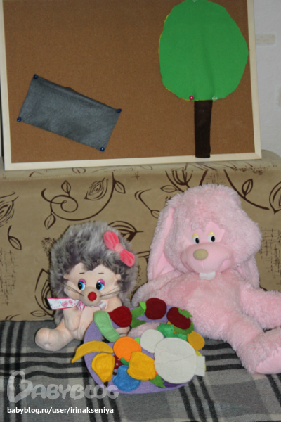 Друзья нашли корзинку с овощами и фруктами и никак не могут разделить их между собой, Ёжик кричит, что любит фруткы, а Зайчик овощи) Вот и попросили она Ксюшу помочь им, нужно было все овощи посадить на грядку, а фрукты на дерево повесить)