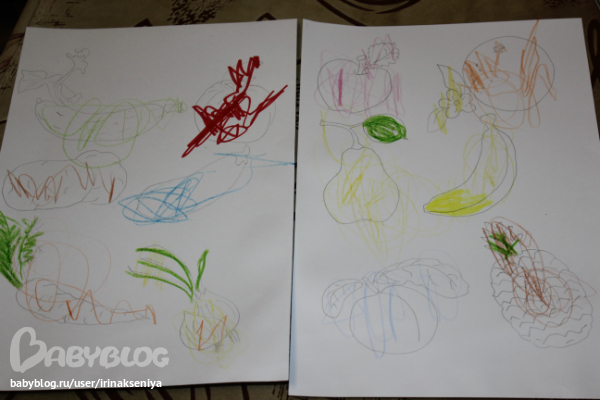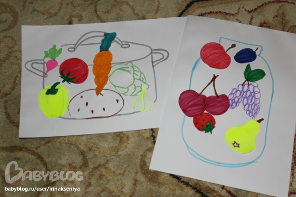 Как-то так раскрасили))) тут же сказали новые слова- Аняня (ананас), Бамана- (бабан), япоко- (яблоко)