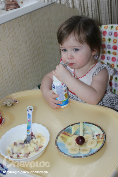 Жарили пластилиновую картошку) Готовили фруктовые салатики-настоящие))Но, Ксюша решила лучше йоги как она его называет попить) чем мамин салатик есть)