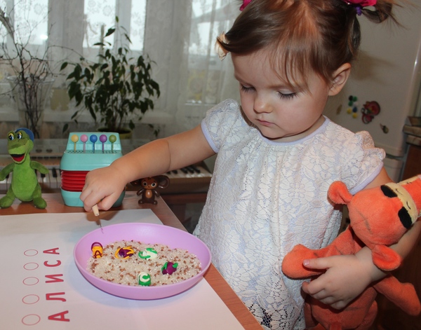Что это может быть? Желание поэкспериментировать, наверно, так как Алиса не раз мне показывала, что она умеет насыпать крупу или наливать воду в различные емкости.