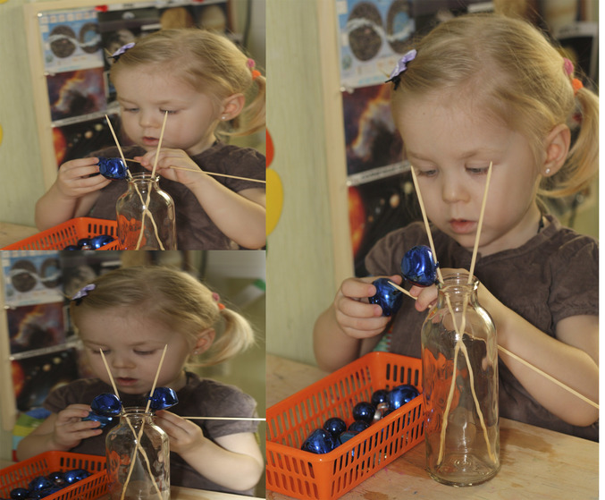 Делали букет из бубенчиков. Изначально, конечно, планировала сделать фетровые розочки и дать дочке "насаживать" на палочки. Но, у нас все как всегда )
