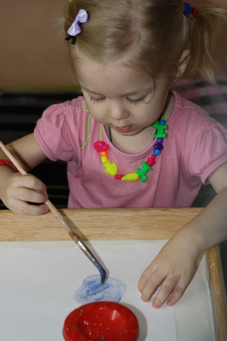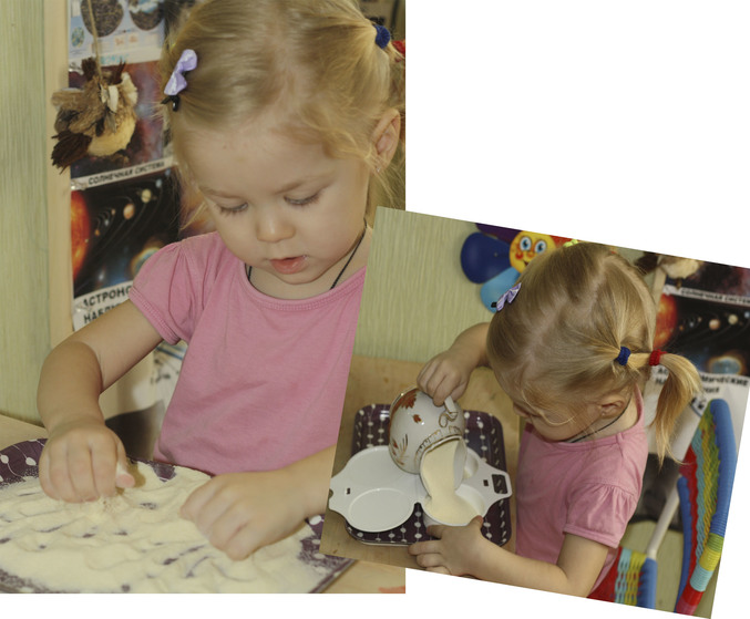 Учились пересыпать манку, ничего при этом не рассыпая. Сначала Софья пересыпала все ровно, до краев. Затем, увидев, что в кувшине еще осталось, досыпала. И конечно же, прямо на поднос ) Но зато потом порисовали на манке )