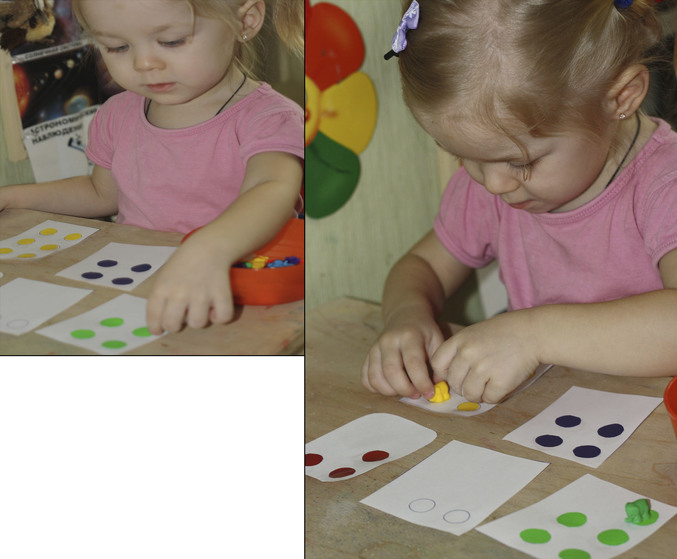 Счетный материал - слоники. Раскладывала по цветам и считала. И очень переживала относительно того, что домики для слоников закончились, а слонов еще много )))