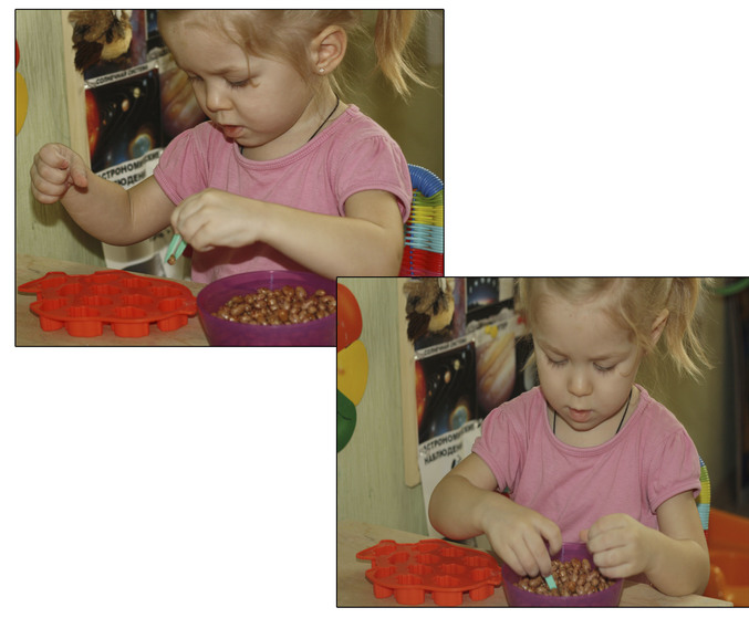 Раскладывали фасоль по ячейкам. Предложила Софье пинцет, попробовала несколько штук переложить, плохо получалось, ибо фасоль выскользала. В ход пошли пальцы ))
