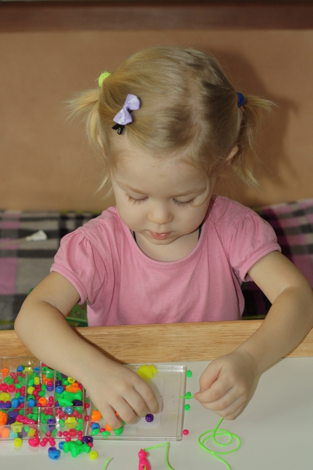 Бусы. Ну ни в какую не идут у нас нанизывание бусинок на веревочку. Что бы я не предлагала, везде отказ. Наденет несколько штук и все, говорит, готово. Но сегодня сделала бусы )) Подкупила )))