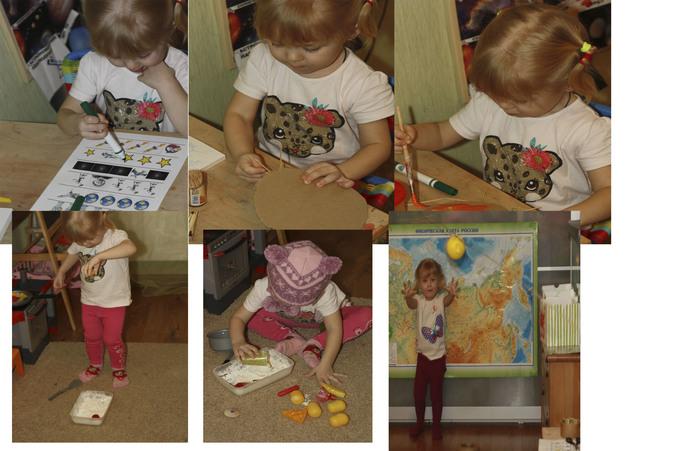 Искали - что лишнее, делали солнце (в картон вставляли зубочистки-лучики), раскрашивали его же. Запускали метеорит и смотрели, что происходит, когда он падает на землю. Соню впечатлило. Поиграли в так называемом лунном песке, закапывали в нем разные предметы. В конце - запускали ракету. Софье очень понравилось, повторили несколько раз.