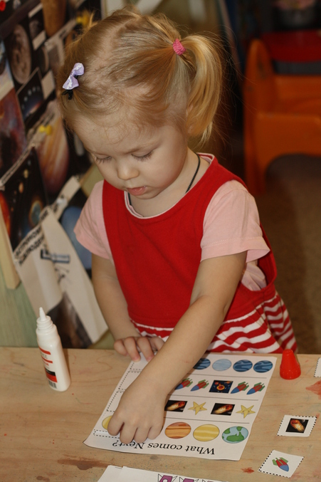 Приклеивали созвездия из школы 7 гномов - . Конечно, пособие тяжело воспроизводимое для ребенка 3-х лет. Но я читала и уже своими словами рассказывала дочке о содержимом. В конце прочитали - как луна с солнцем ходили друг к другу в гости.