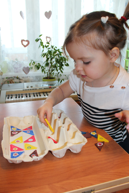 Раскладывать нужно было предметы на основании двух критериев - цвет и рисунок на треугольнике + место расположения.