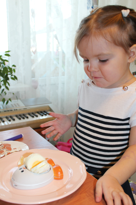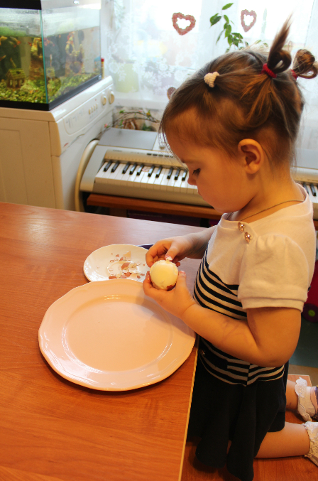 Начали с практических навыков - чистим яйцо и разрезаем его с помощью яйцерезки.