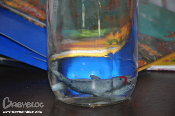 Косте понравилось смотреть как в театре - он садился, ставил аквариум и мне говорил "Сать!" и ждал что я начну рассказ. И я начинала - "Как однажды плыла косатка в другу дельфину, а на встречу ей...." и каждый раз новый рассказ на сколько хватит фантазии. "Акула преследовала маленькую рыбку чтобы съесть, рыбка спряталась на самом верху и акула пропыла мимо и не заметила маленькую рыбку...."