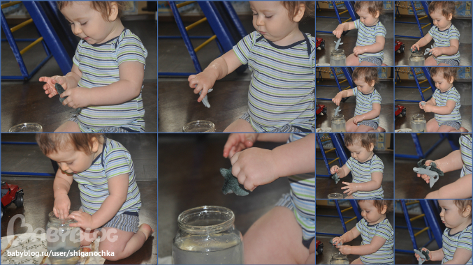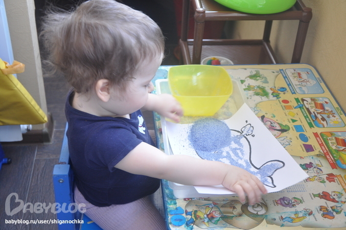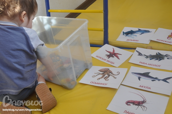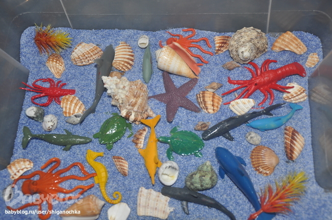 В Первый день сюрпризом стало появление сенсорной коробочки - крашенная манка (красила в блендере - манка + вода с гуашью, взбивается в блендере, плюс в том что сушить практически не надо - она уже сухая получается, воды надо чуть чуть), и морские обитатели (нашла только самых обычных в Дочках сыночках - взяла две упаковки разных по 69 руб.).