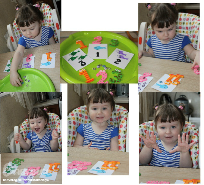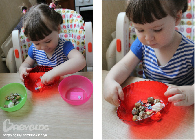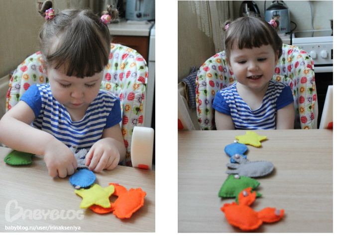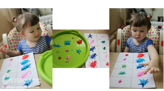 Здесь все просто, нужно было на подносе выбрать одинаковых рыбок и разложить их всем семейством. Ксюша как всегда сказала: Папака, мамака и я-Сюсика.. справилась отлично