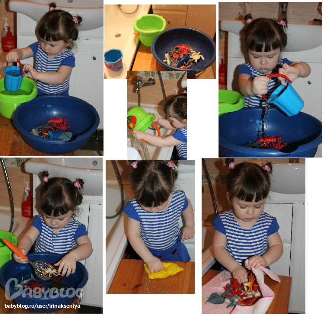 Для начала нужно было из большого ведерка маленьким перенести водичку в тазик. Все что разливалось вытирали тряпочкой, затем пустили в тазик жителей и начали их сачком вылавливать)))т.к. жители у нас крупные пришлось помогать рукой, лишнюю воду из веда вылели в ванную обратно... Когда все были выловлены, нужно было протереть всех полотенцем, спасибо за идею Елене
