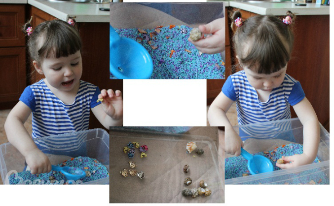 С утра Ксенечка получила сенсорную коробочку, в которой спрятались разные рыбки, ракушки и прочие камушки.